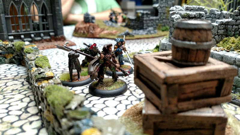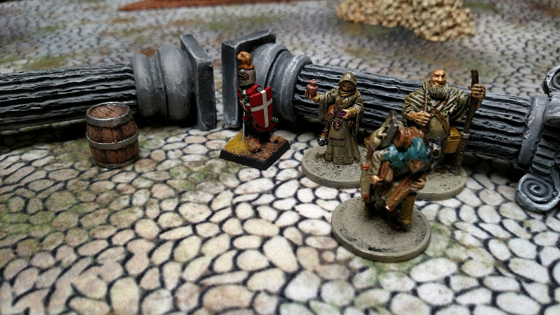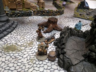 The game began with each warband filtering into the ruined city and angling for the closest treasure tokens (represented by barrels and chests in these pics).