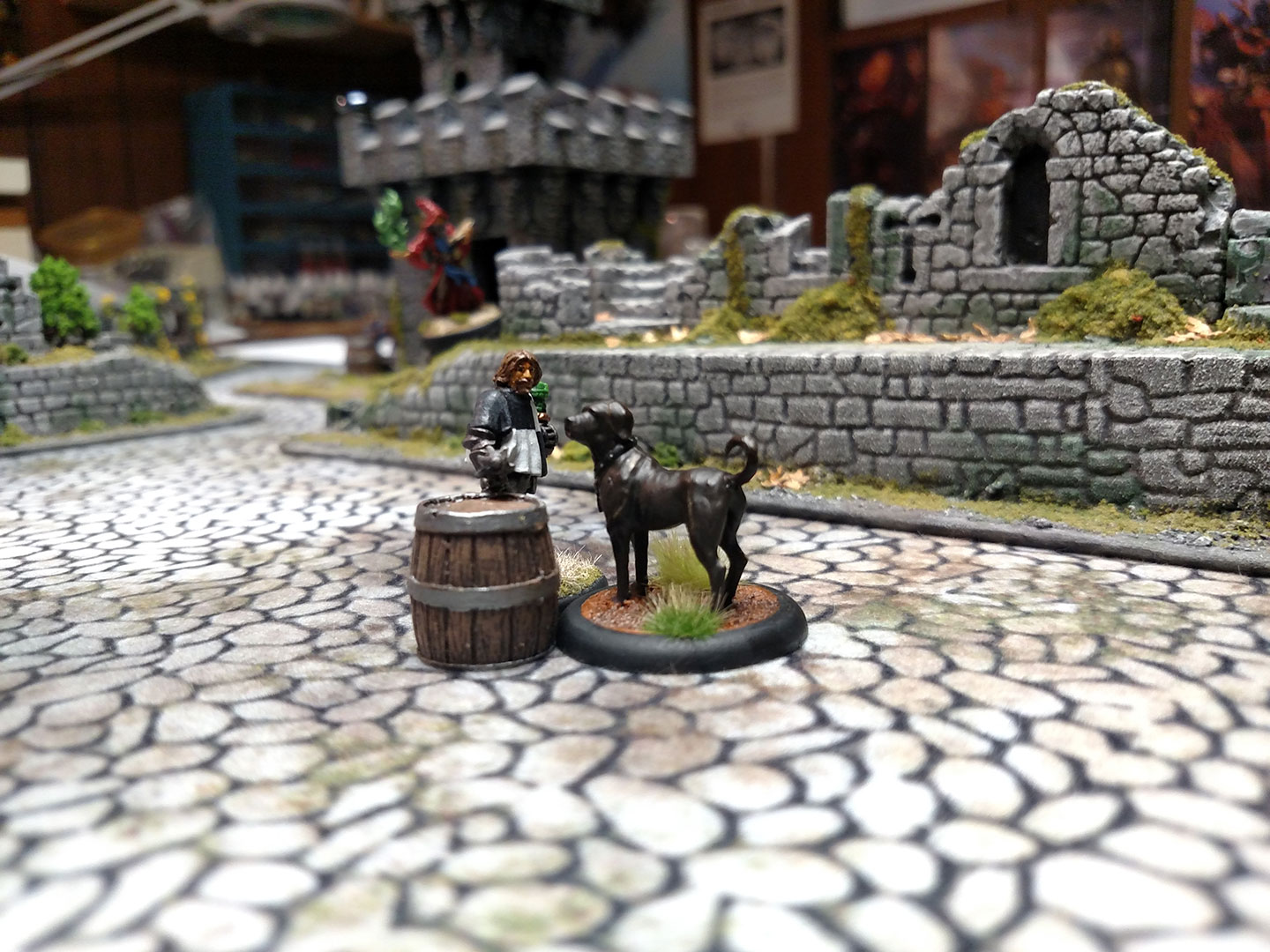 My attempts to stymie Josh’s advance were starting to bear fruit — I raced my man-at-arms up to a treasure token while my wizard perched atop a ruined wall, ready to fling spells if needed. They were opposed only by Josh’s warhound ….