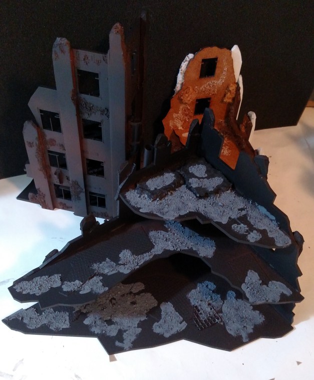 If you want other ways to make the next set of ruins pop, a few bits of wire, rebar, I-beam, etc poking out from the ruined floor edges will go a long way. Rounding or gouging the strait edges on the ruined parts helps too.