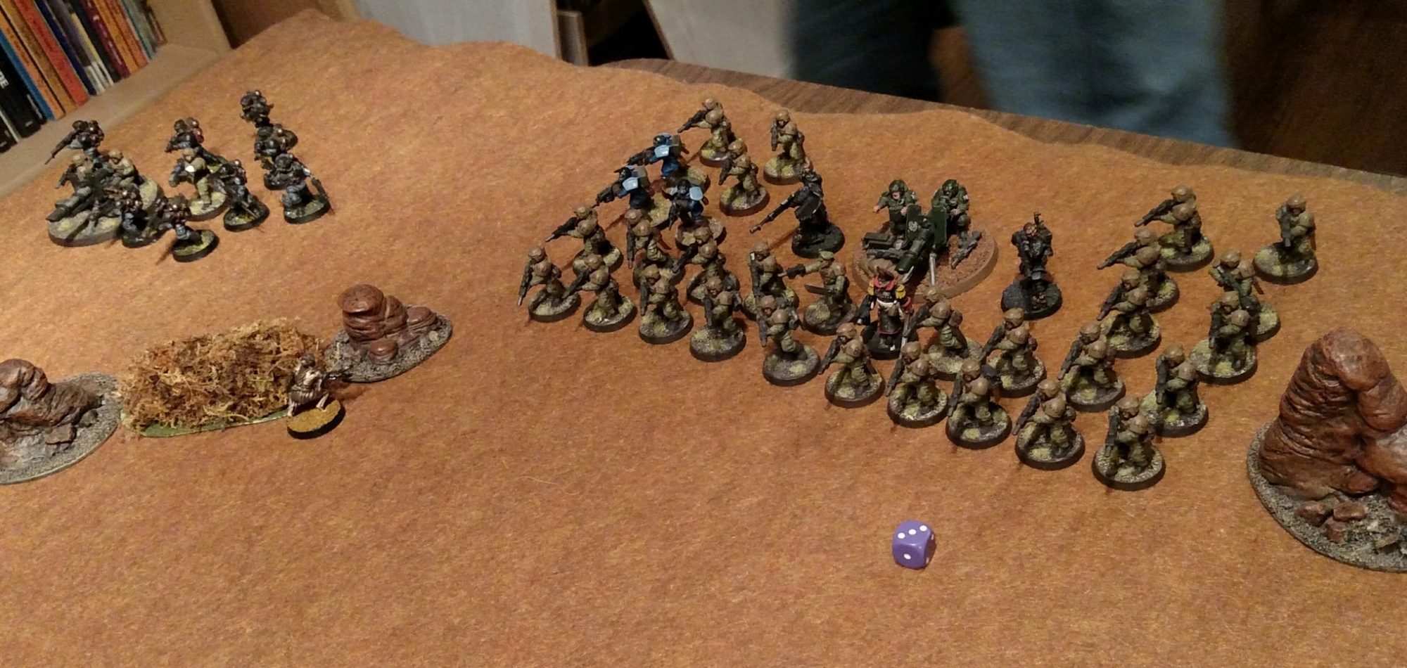So that’s my way of saying that our best-laid plans for a quick, two-hour weeknight game were dashed by his enthusiasm for sci-fi army men. Check out his deployment for our game. This is just a 30-man squad of conscripts plus a command squad!