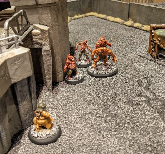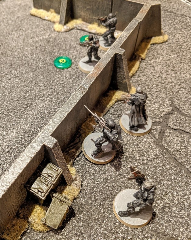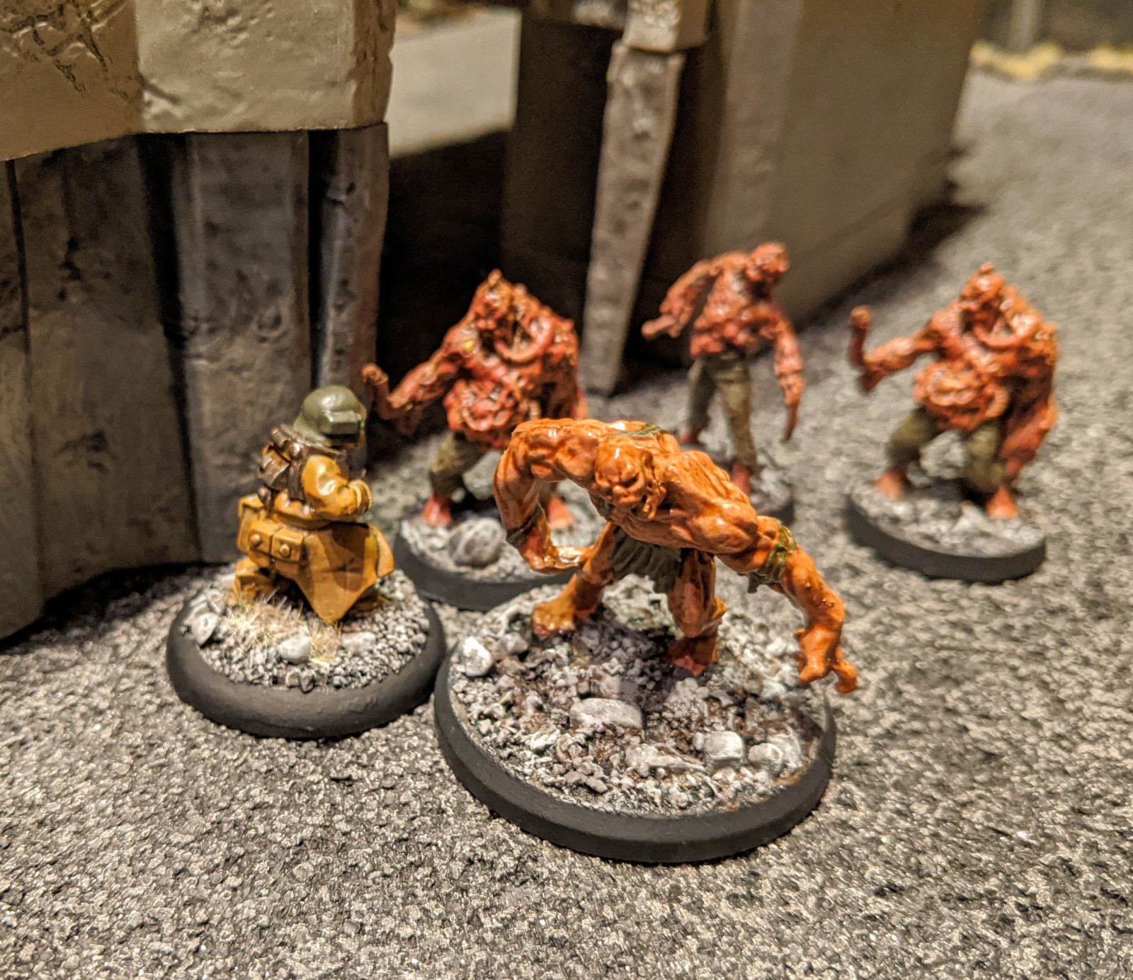 I created some basic starting crews for the players, and then we got started. We set up a 4×4 foot table, slightly larger than the 3×3 size recommended in the rulebook, due to our surplus of players. Each side alternated by activating one figure, performing actions, and then passing play to the opposing team. The first couple of turns were focused on learning the basic game system and moving out of our deployment areas. But before too long, the players got close enough to begin exchanging some ranging volleys of automatic rifle fire as they slipped through the ruins.