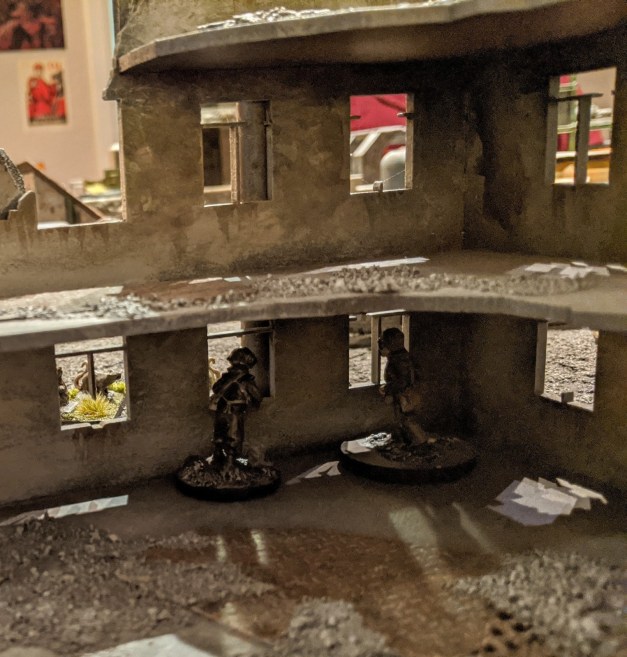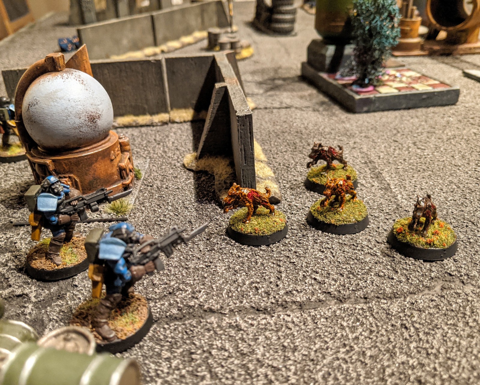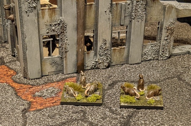 From there, the game developed into a series of running gun battles as the players lobbed grenades and laid down overlapping fire to cover their advance. John’s crew triggered the next hot spot and was able to take cover in a ruined building as a mob of giant rats scampered toward them.