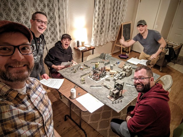 What started out as a simple introductory game quickly swelled to a two-on-two team slugfest, as players signed on with their scrappy crews, lured by the promise of illicit salvage in the eponymous Exclusion Zone. I rode herd on this motley assemblage as impartial (some would say sinister) gamemaster. I was pleased to get such a robust turnout for this game. Here’s a goofy photo as we prepared to brave the dangers of the Zone.