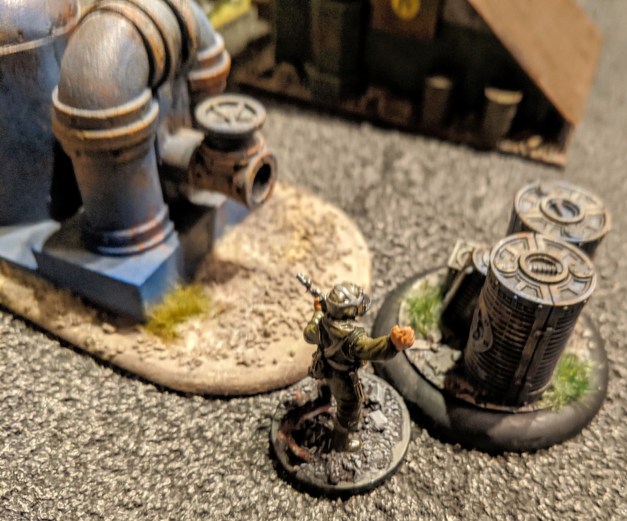 Here’s John’s hardened scavenger moving in to search a decommissioned air compressor next to a derelict pumping station.