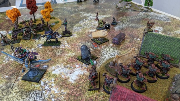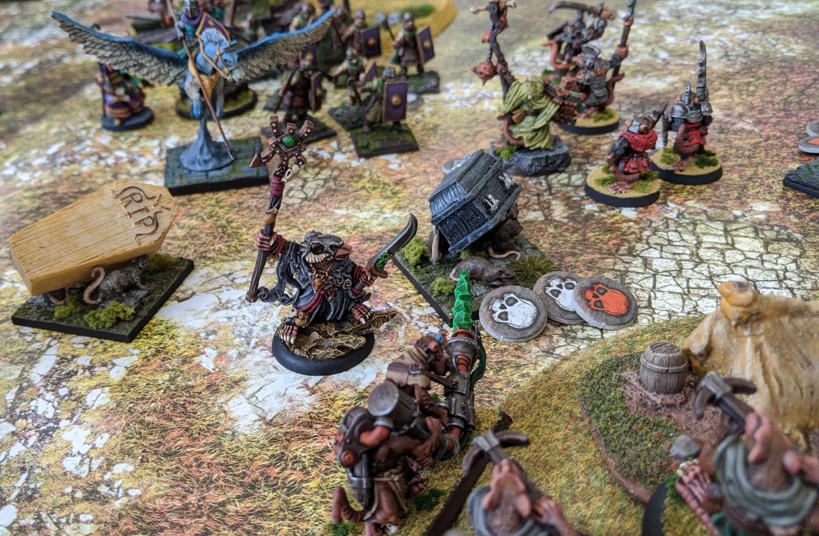 You can see the caskets, being borne by a swarm of rats, in the photo above. The goal was to escort them across the battlefield and exit through John’s table edge. I’d have to keep moving at a pretty good clip to ensure a reasonable chance of winning. No dithering and no time wasted on fruitless combat!