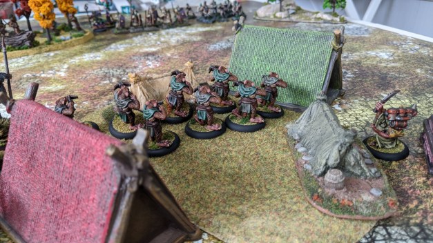 So I started maneuvering away from them, angling up the right flank and positioning some of my ratmen as blocking units to slow down the attackers. It worked! For a couple of turns, anyway. My newly painted levies with bows occupied this encampment, staying in cover and delivering fairly effective missile fire throughout the game.