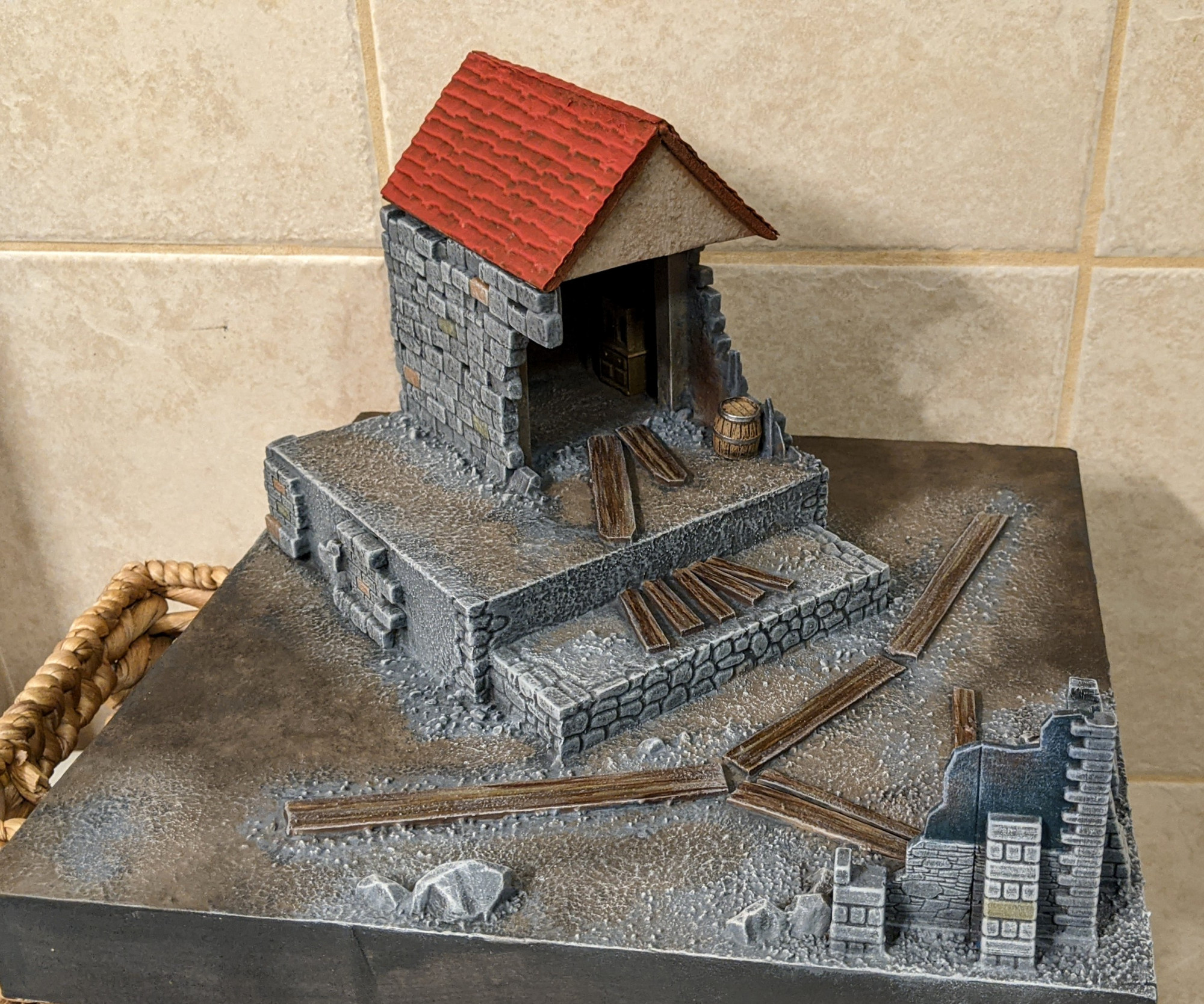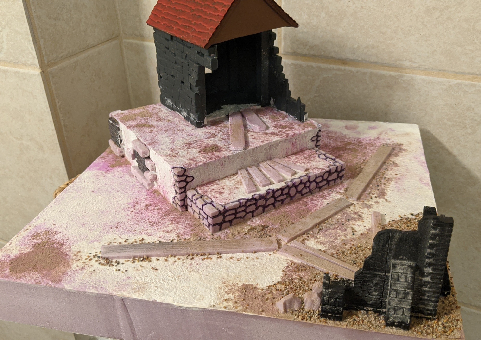 We all got a good start on the terrain and left with a pretty good idea of where this particular project is headed. My first tile took shape at the terrain day, and I continued working on it in the weeks to come. Here’s the progression from basic idea to finished product.