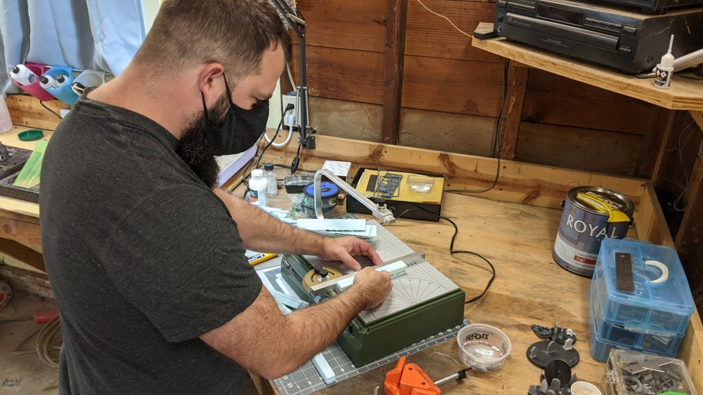 John had done the heavy lifting by acquiring a boatload of pink foam and cutting some tiles and scraps for us to work with. We also put his Proxxon hot wire foam cutter to good use. It was a fun afternoon of chatting, chopping, and chortling.