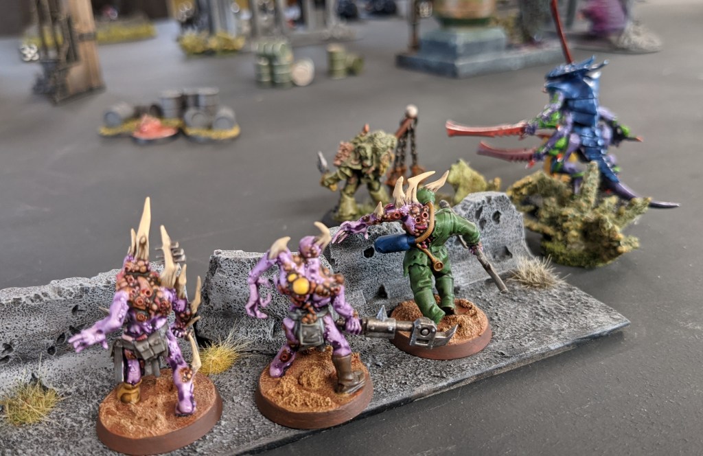 We placed 5 objectives onto the battlefield, using some newly painted markers that John had just knocked out. They were little baby Tyranids, so we decided that the narrative plot hook involved the Tyranids seeking to retrieve some hatchlings from a plague-infected city. The forces of Nurgle were only too happy to run interference on this operation…