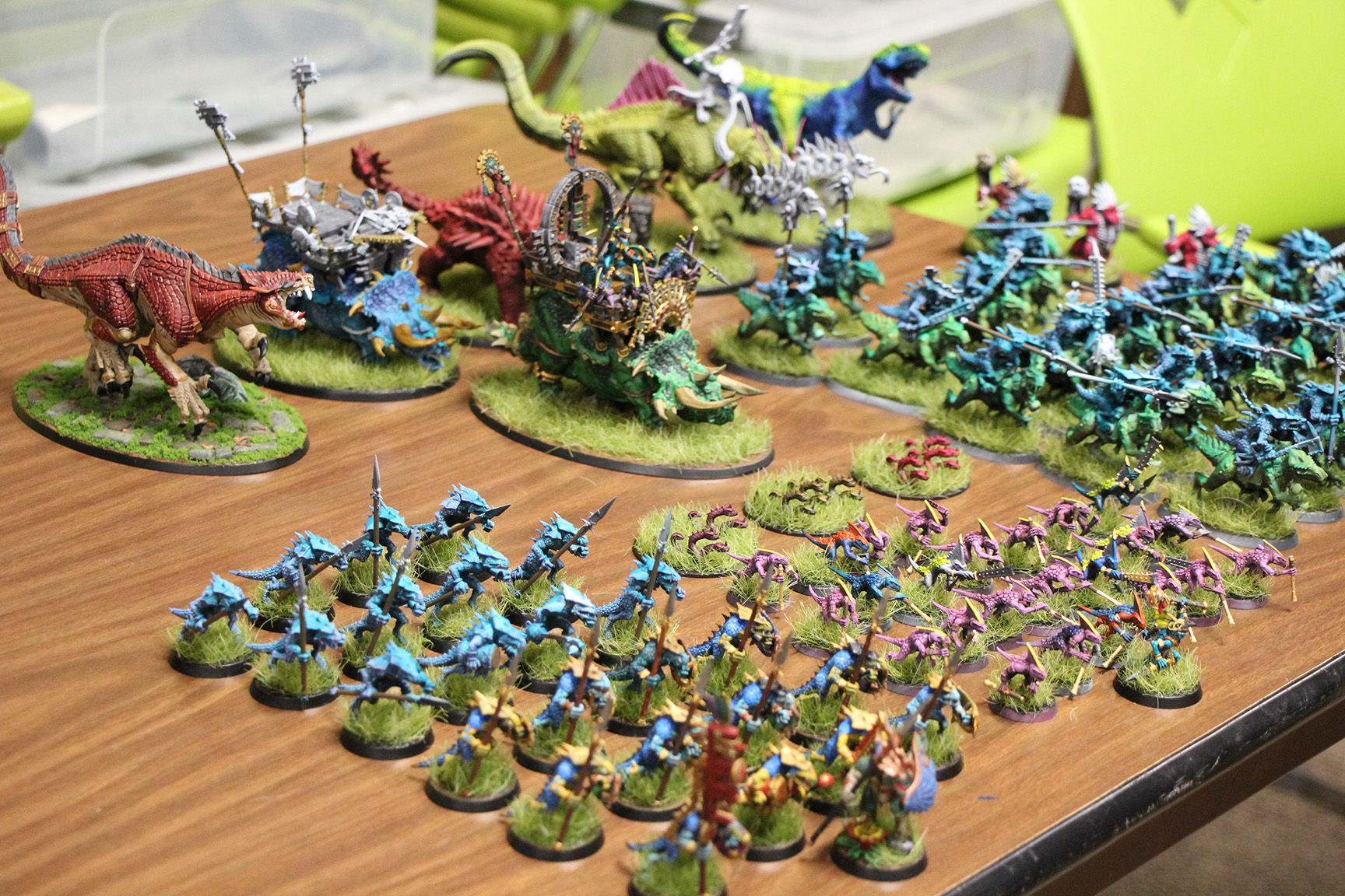 Jim surprised us by showing up with a brand new Lizardmen army! Jim is known for painting armies with relatively muted color palettes, like Imperial Guard with their olive drab camouflage and armored vehicles. So it was a real treat to see him tackle a new, brightly colored army for a change.