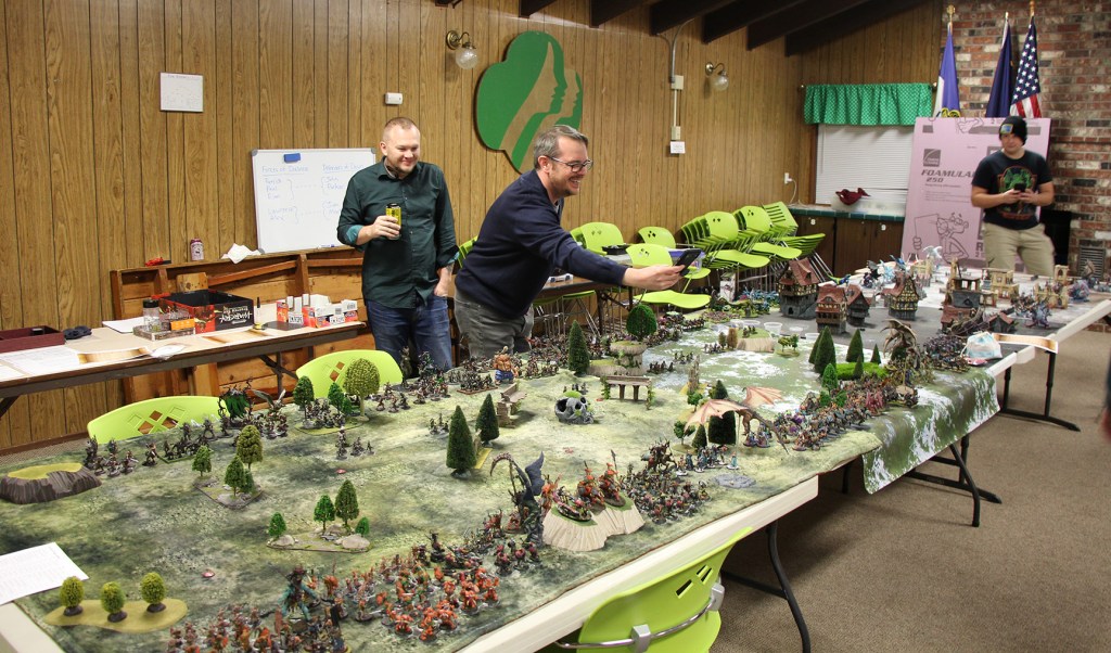 Lawrence has always had a thing for gigantic centerpiece models, and Apoc-Luck always gave him a wonderful excuse to drag out all the gigantic models in his collection that didn’t normally hit the table in our smaller skirmish games. Here he brought his beautifully painted Nurgle Daemon army. And lest we forget — Lawrence also outdid himself by bringing a mac & cheese bar for us to graze on during the game. Thanks, Lawrence!