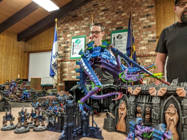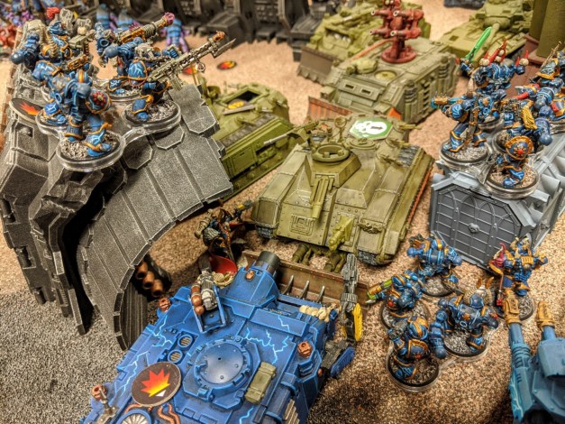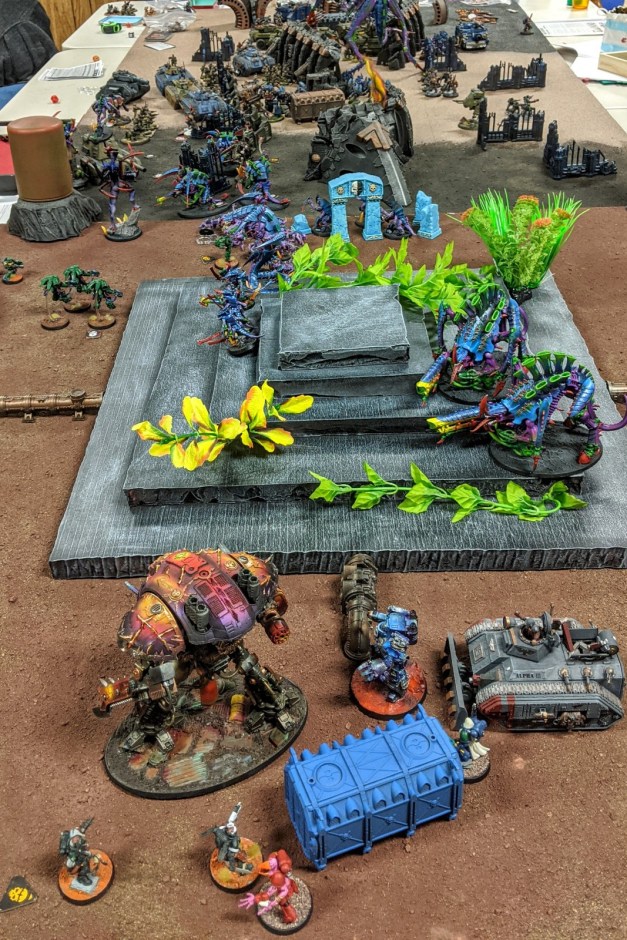 These games are typically structured around simple scenarios, with instructions to each player that can be summed up as “bring all your painted models and we’ll shoehorn everything into a game.” Game balance goes out the window in favor of a grand spectacle of beautifully painted armies clashing on the field of battle surrounded by gorgeous terrain and scenery. Here’s a pic from last year’s Apoc-Luck game which sums up the aesthetic we’re aiming for.