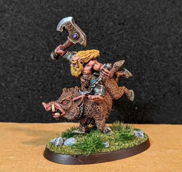 Normally, mounted models exhaust me, because you’re basically painting two figures disguised as one. I feel betrayed by the time I’m done with the model. For this figure, I tackled the boar primarily with contrast paint, and it worked swimmingly. Consequently, I was able to focus most of my effort on the berserker.