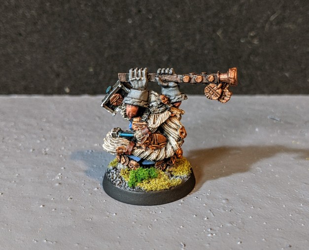 I’m thinking that staff in his hands is some sort of magic wand, and he’s in the middle of casting a runic enchantment of some sort, maybe targeting a chaos barbarian’s mid-thigh area. He’s got a big ol’ hammer on his back in case magic just doesn’t cut it.