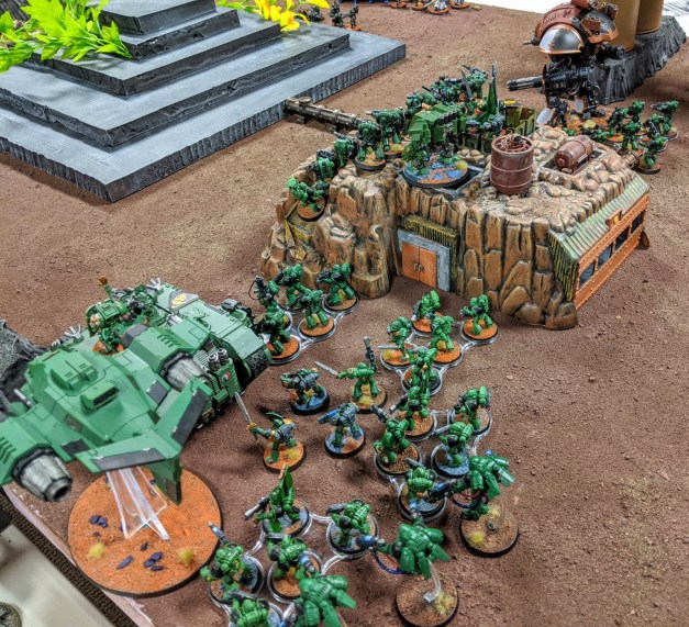 The Salamanders continued pouring fire into the surging mass of Tyranids rushing across the battlefield at them. Their vanguard elements (Terminators and a Land Raider) got slaughtered, but their strongpoint remained secure even as the endgame approached.